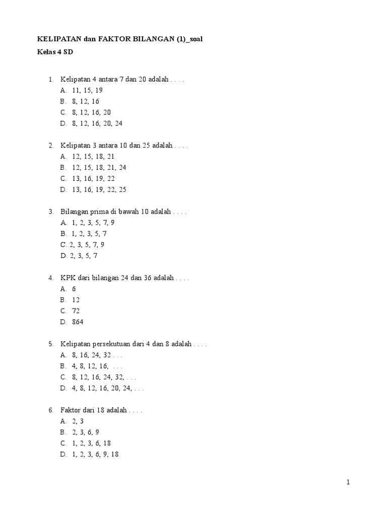 Dalam dunia matematika, konsep kelipatan merupakan salah satu pondasi penting yang perlu dikuasai oleh siswa, terutama di jenjang Sekolah Dasar (SD). Memahami kelipatan akan membantu siswa dalam berbagai operasi hitung, pemecahan masalah, dan bahkan dalam mempelajari konsep matematika yang lebih kompleks di masa mendatang. Artikel ini dirancang khusus untuk siswa kelas 4 SD, menyajikan kumpulan soal latihan yang berkaitan dengan kelipatan, lengkap dengan pembahasan dan jawaban yang jelas. Tujuannya adalah agar siswa dapat berlatih secara mandiri, menguji pemahaman mereka, dan memperkuat konsep kelipatan dengan cara yang menyenangkan dan efektif.