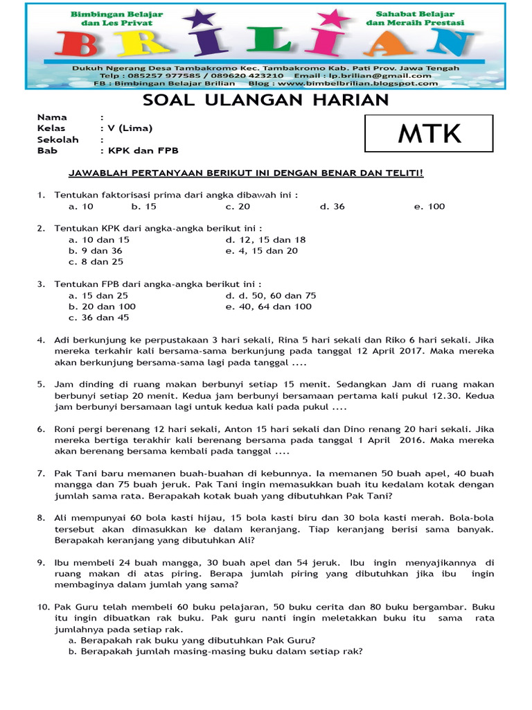 Perkalian dan pembagian adalah pondasi penting dalam matematika. Namun, ada dua konsep yang seringkali menjadi batu loncatan bagi siswa kelas 4 untuk memahami lebih dalam dunia bilangan, yaitu Kelipatan Persekutuan Terkecil (KPK) dan Faktor Persekutuan Terbesar (FPB). Kedua konsep ini terdengar sedikit rumit, namun dengan pemahaman yang tepat dan latihan yang cukup, siswa kelas 4 pasti bisa menguasainya. Artikel ini akan membahas secara mendalam tentang KPK dan FPB, dilengkapi dengan berbagai contoh soal latihan yang dirancang khusus untuk tingkat kelas 4, beserta penjelasannya, agar para siswa dapat berlatih dan siap menghadapi berbagai tantangan soal.